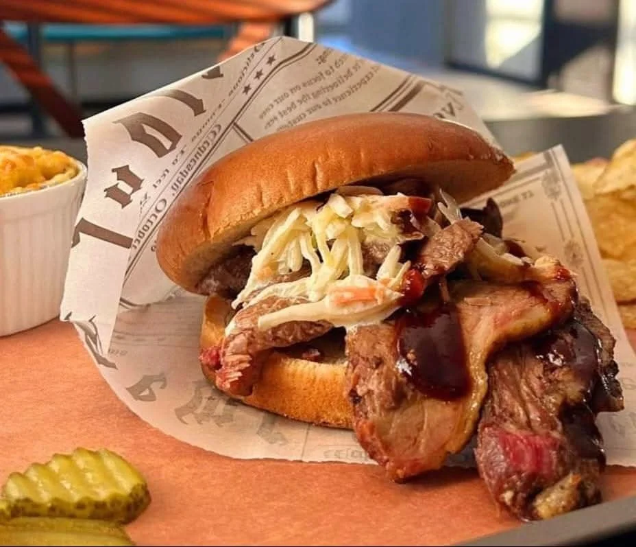 -Välissä pitkään savustettua black angus härkää, coleslaw ja talon oma BBQ kastike